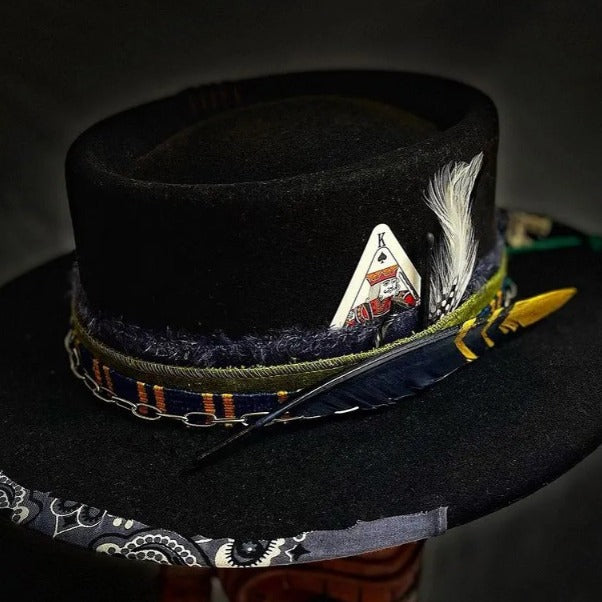 “Distressed Fedora with Red Multi-color Patchwork Design” is hand-distressed, hand-dyed, and hand-torched, ensuring no two share the same color or design. Each piece is uniquely imperfect, with subtle variations from product images.