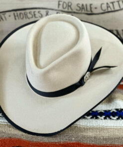 This light belly and it’s tan tones fit the bill with the black trim. The pinched front crown is 4.5″ in the back with a slight slope to 4″ in the front. The 4″ brim has a soft roll on the sides with a black bound edge. The 7/8″ grosgrain ribbon has an old fashioned look with a Cross concho to anchor it. Overall this hat is very unique with it’s look, band and style.