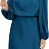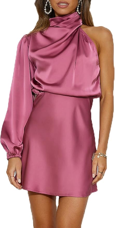 - DESIGN: You are definitely going to love our long sleeve satin dress. We’re getting all the likes with the high neckline, one long sleeve, a back cut-out and a flowy fit.Whether you go to the party or night out, paired with boots always go well with it